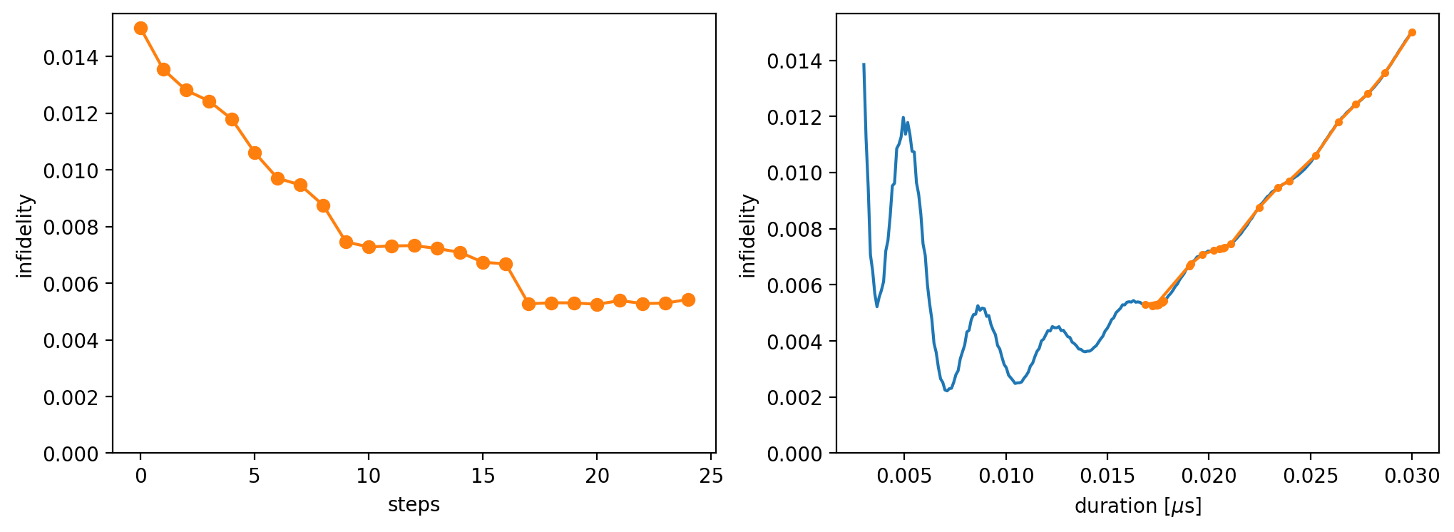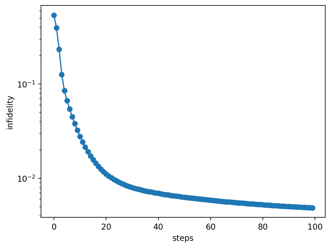 Infidelity is plotted as a function of the number of optimization steps. Starting from an initial gate with infidelity near unity, the optimization gradually converges toward zero infidelity using a highly conservative learning rate.