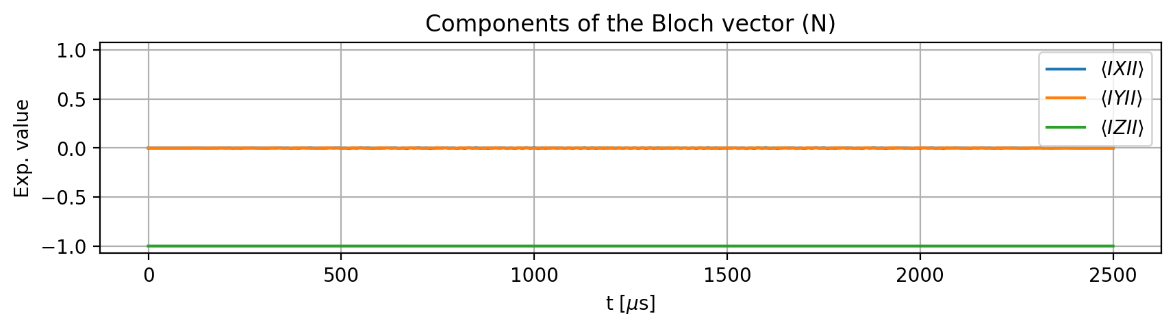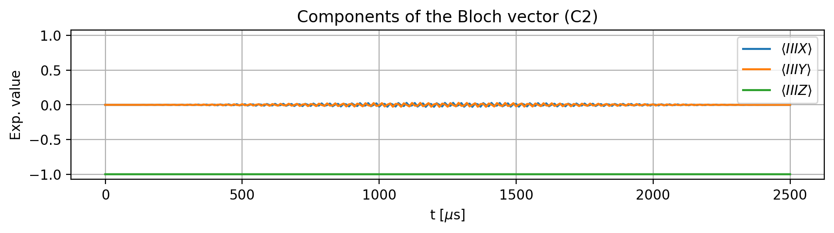 To examine the effect of the pulse, we define an initial state. The electron spin undergoes a \(2\pi\) rotation only when the nuclear spins are in their qubit state \(\ket{1}\), which corresponds to the quantum number -1 for the nitrogen and 1/2 for the carbon nuclear spins. If we change -1 to 0 for N, or 1/2 to -1/2 for either C1 or C2, the rotation should no longer occur: