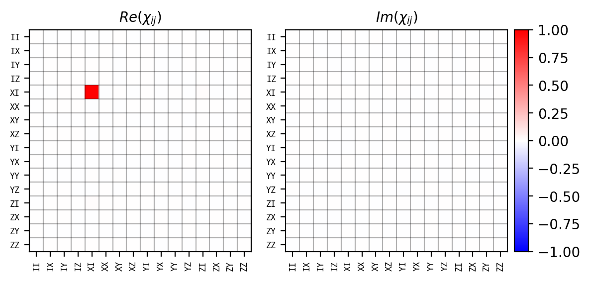 where \(P\)-s are the \(n\)-qubit Pauli basis elements (Pauli strings), and \(\chi_{i,j}\) is the complex-valued \(\chi\)-matrix on the Pauli basis (process matrix), whose real and imaginary parts both fall within the range \([-1, 1]\).
