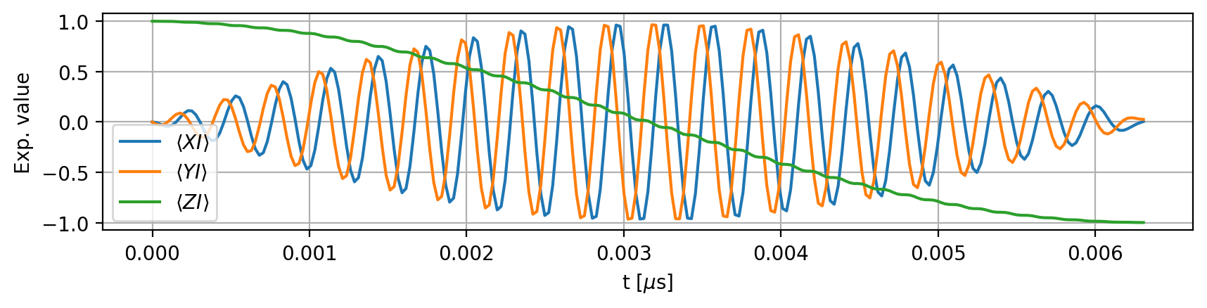 The shape corresponds to shots × time points × operators. By default, the calculation is performed in the product basis and in the rotating frame. Without retrieving the numerical values, we can plot the expectation values at once (here in the lab frame):